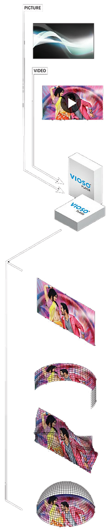 Vioso 특허기술인 " Camera Based Auto Edge Blanding " 을 사용하여 어떠한 형태(표면)의 Multi 영상도 손쉽게 구현할 수 있습니다.